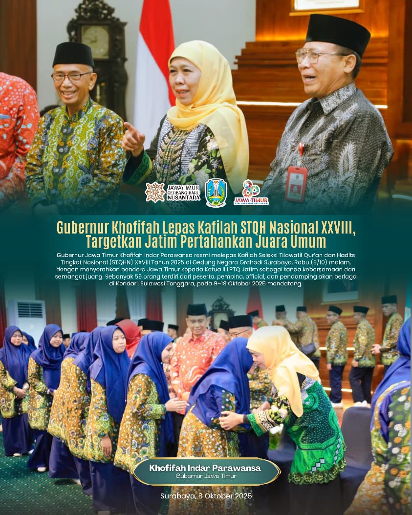 Gubernur Jawa Timur Khofifah Indar Parawansa secara resmi melepas Kafilah Jatim pada Seleksi Tilawatil Qur’an dan Hadis Tingkat Nasional (STQHN) XXVIII Tahun 2025 di Gedung Negara Grahadi Surabaya, Rabu (8/10).