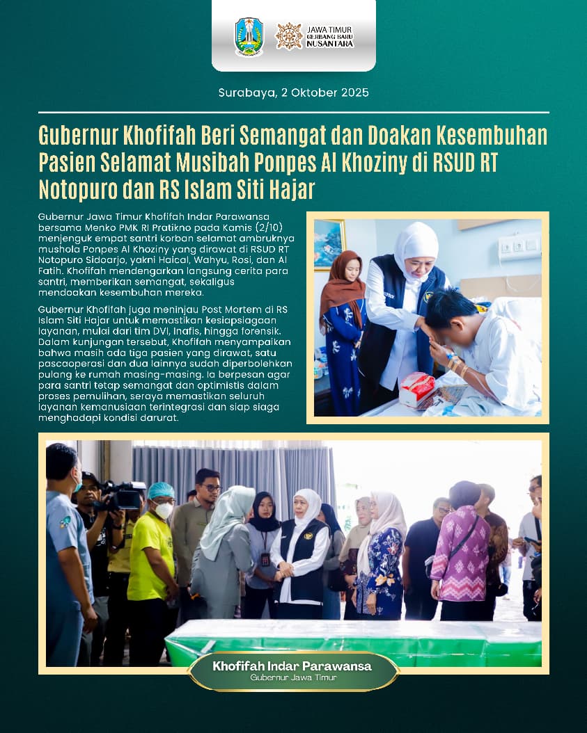 Gubernur Jawa Timur Khofifah Indar Parawansa menjenguk para santri yang selamat dari musibah ambruknya mushala Pondok Pesantren Al Khoziny, Buduran, Sidoarjo. Kunjungan untuk memberi semangat sekaligus mendoakan kesembuhan para korban selamat tersebut dilakukan di RSUD R.T. Notopuro dan RS Islam Siti Hajar, Kamis (2/10).