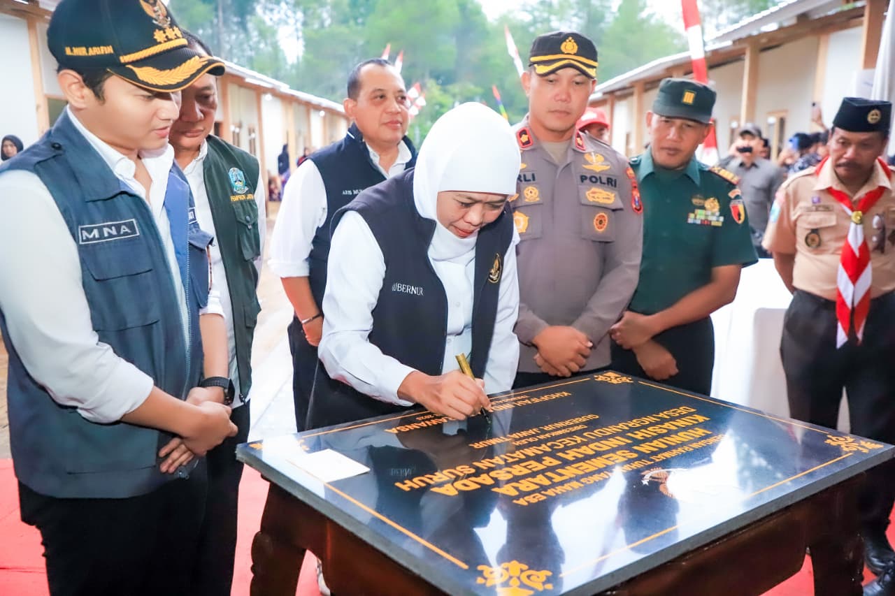 TRENGGALEK, 6 DESEMBER 2025 – Gubernur Jawa Timur Khofifah Indar Parawansa meresmikan hunian sementara (huntara) Kinasih Indah Persada di Desa Ngrandu, Kecamatan Suruh, Kabupaten Trenggalek, Kamis (4/12).