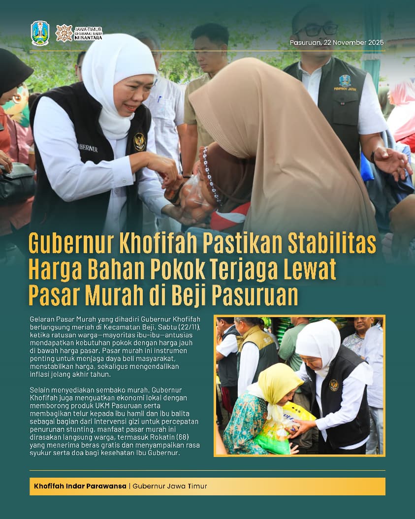 Gubernur Jawa Timur Khofifah Indar Parawansa memastikan stabilitas harga bahan pokok jelang Nataru tetap terjaga dengan digelarnya Pasar Murah lebih merata . Kali ini pasar muran digelar di Kantor Kecamatan Beji, Kabupaten Pasuruan, Sabtu (22/11).