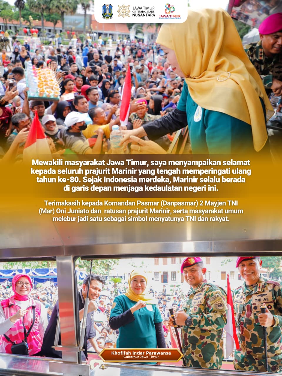 "Mewakili masyarakat Jawa Timur, saya menyampaikan selamat kepada seluruh prajurit Marinir yang hari ini memperingati ulang tahun ke-80. Sejak Indonesia merdeka, Marinir selalu berada di garis depan menjaga kedaulatan negeri ini. Semoga Marinir Indonesia terus berjaya dan menjadi penjaga kedaulatan yang tangguh di darat, laut, dan udara,” pungkasnya