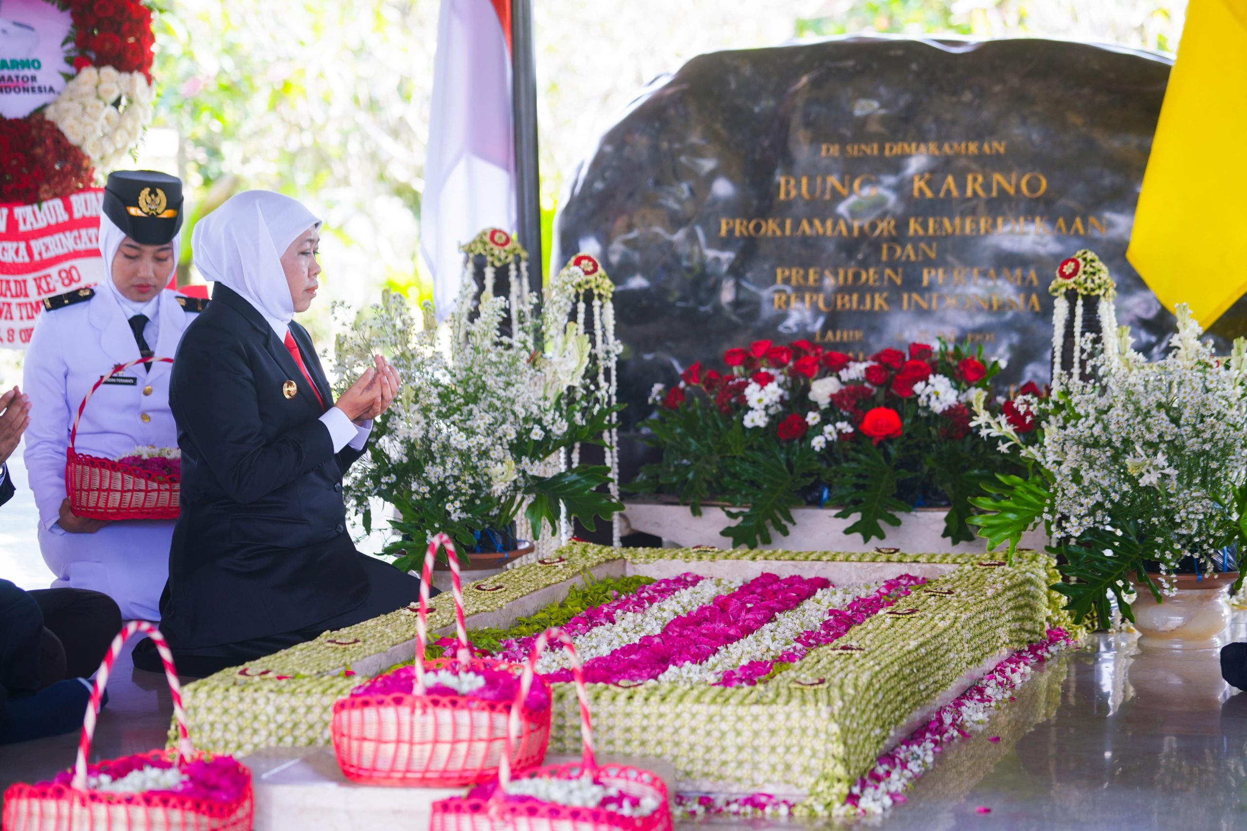 Jelang Hari Jadi ke-80 Pemerintah Provinsi Jawa Timur, Gubernur Jawa Timur Khofifah Indar Parawansa berserta jajaran Pemprov Jatim ziarah makam Proklamator RI Soekarno di Jl. Ir. Soekarno No.152, Bendogerit, Kec. Sananwetan, Kota Blitar, Rabu (8/10).
