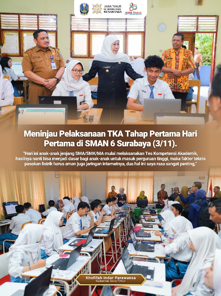 Gubernur Jawa Timur Khofifah Indar Parawansa meminta seluruh satuan pendidikan, khususnya Dinas Pendidikan Jatim untuk memastikan keamanan pasokan listrik dan kestabilan jaringan internet. Instruksi ini disampaikan berkaitan dengan Tes Kompetensi Akademik (TKA) yang digelar pada Senin (3/11).