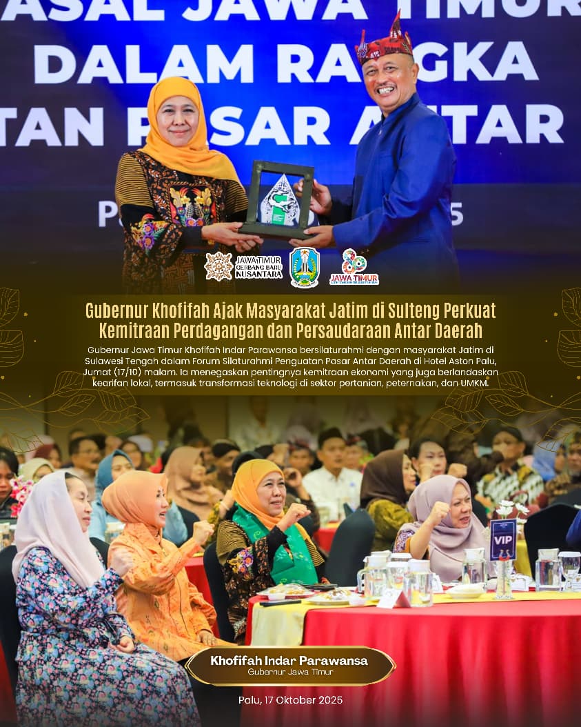 Gubernur Jawa Timur Khofifah Indar Parawansa menggelar Forum Silaturahim bersama masyarakat Sulteng asal Jatim dalam rangka penguatan pasar antar daerah yang digelar di Hotel Aston, Kota Palu, Prov. Sulawesi Tengah, Jumat (17/10) malam.