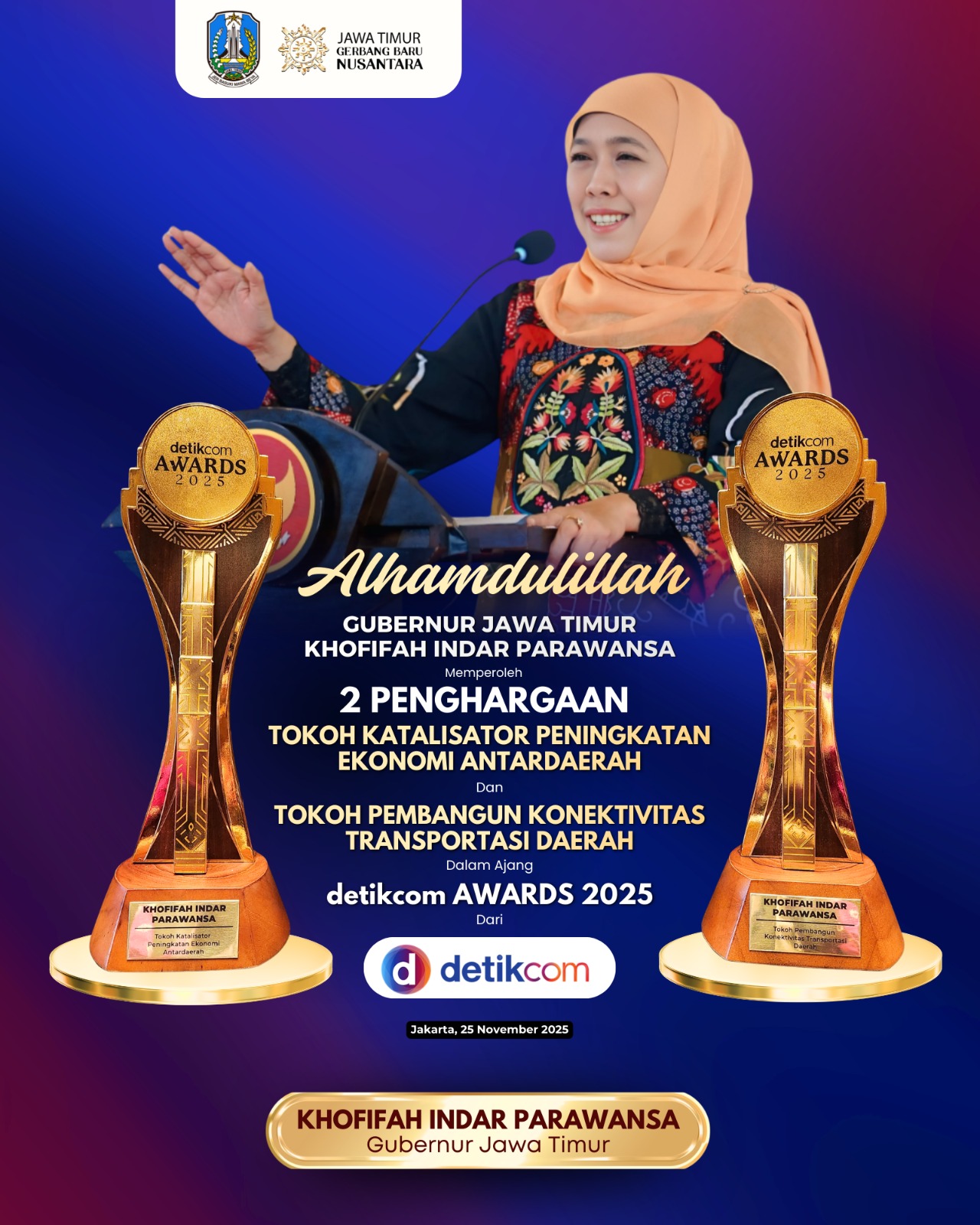 Dua program Gubernur Jawa Timur Khofifah Indar Parawansa yakni Misi Dagang dan Trans Jatim mendapat penghargaan nasional dari Detikcom Award 2025. Dua program ini menjadi pioneer ekonomi kerakyatan.