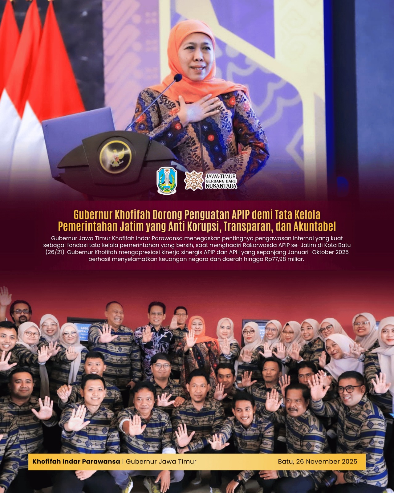 Gubernur Jawa Timur Khofifah Indar Parawansa terus mendorong Aparat Pengawas Internal (APIP) atau Inspektorat Daerah di Jawa Timur untuk meningkatkan efektivitas pengawasan sehingga tata kelola pemerintah lebih transparan dan akuntabel.
